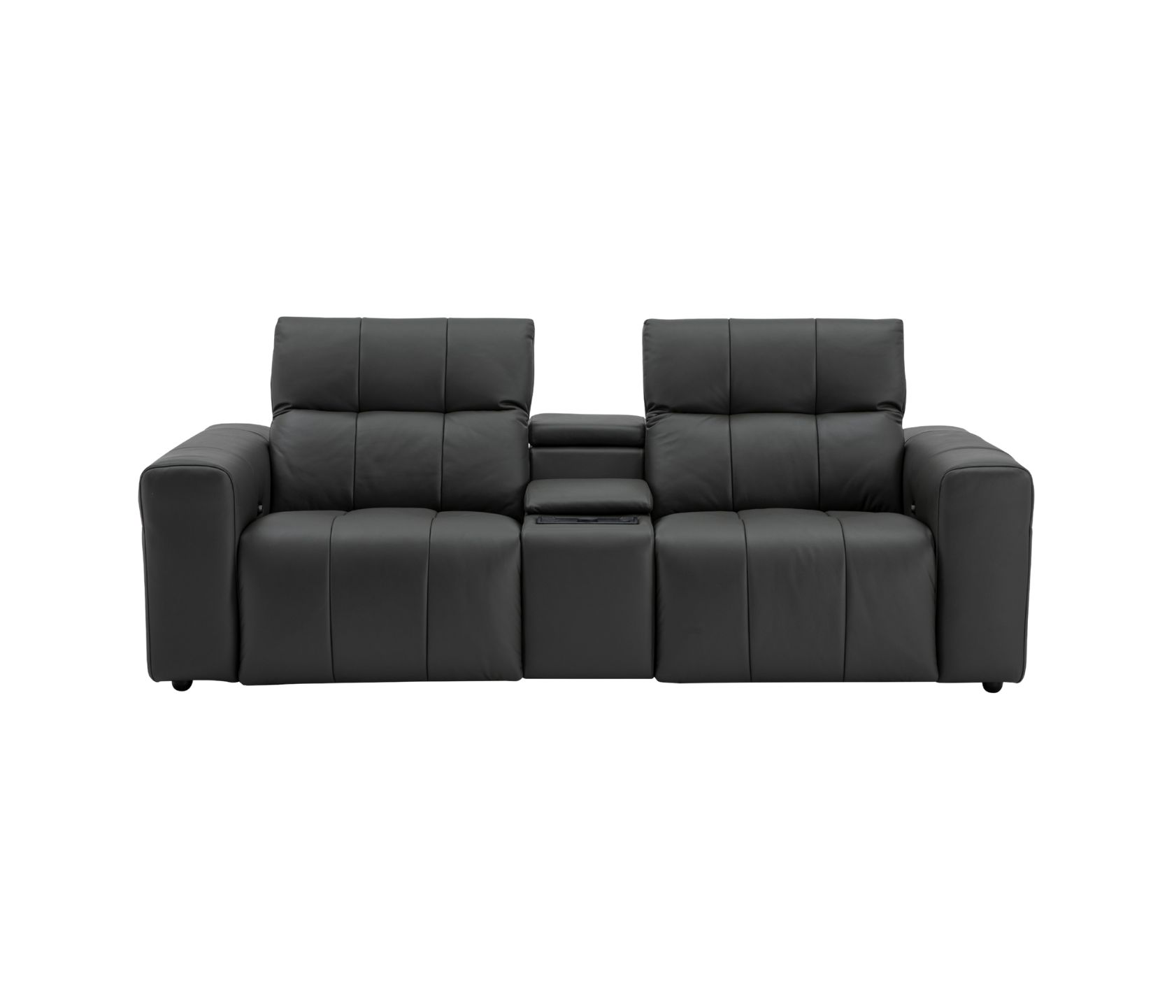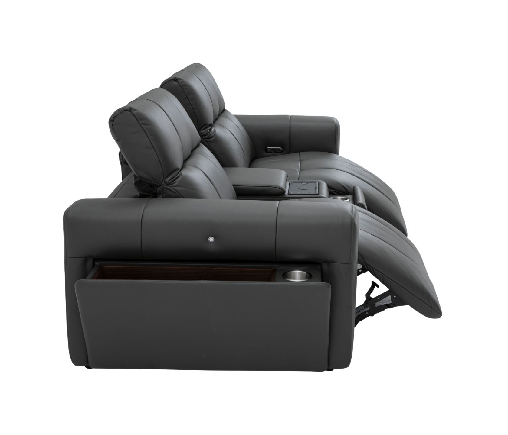 - Integrated storage console with hidden compartment for remotes and accessories